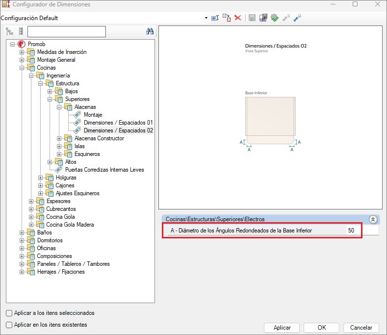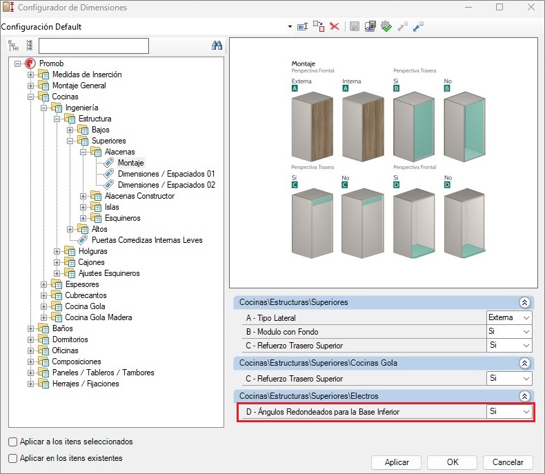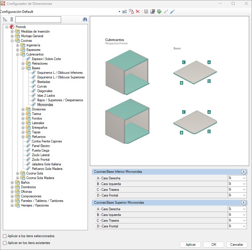 Si la opción es verdadera, la base se puede cambiar por modelo. Estas nuevas configuraciones están disponibles en la línea de Cocinas, en los módulos Superiores - Electros, y pueden ser ajustadas mediante el siguiente camino: