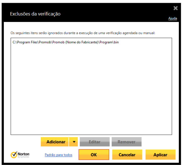 6. In the displayed window locate the Promob installation directory, select the Promob (Manufacturer Name)\Program\bin folder and add all files from the bin folder to be excluded from the scan. By default, Promob is installed to Local Disk (C:)\Program Files\Promob;