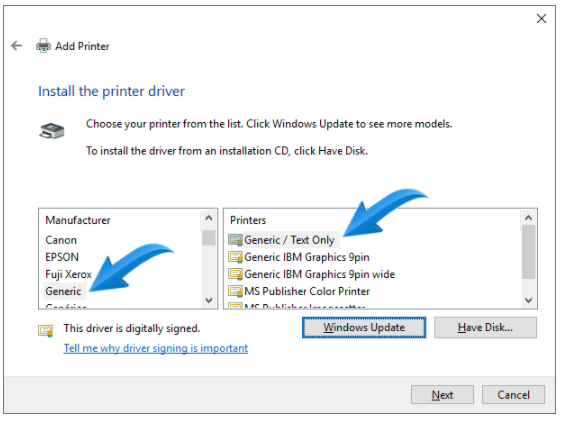 5. Select the Generic option in the left box, and in the right box select Generic/Text Only then click next.