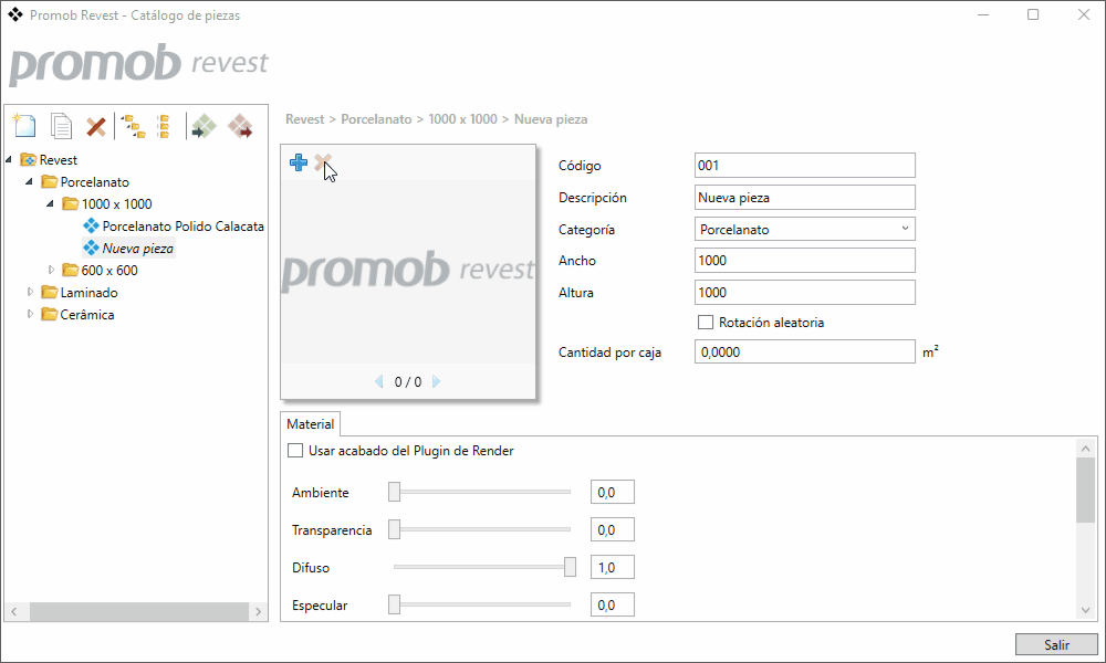 En Promob Revest es posible registrar nuevas piezas en la biblioteca de revestimientos, personalizando categorías, dimensiones, materiales y acabados según la necesidad del proyecto.
