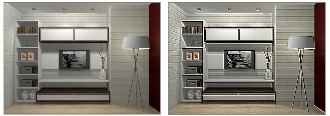 - Contorno: Muestra la línea o superficie que limita la parte externa de los elementos del proyecto. Cuanto menor sea su valor, más suave será el contorno de las líneas. Cuanto mayor sea su valor, más fuerte será el contorno de las líneas y más líneas de la imagen se mostrarán, además de poder percibir más detalles en la imagen;