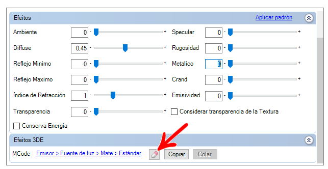 Si el sistema dispone de Real Scene 2.0, es necesario registrar el material correctamente para que tenga el efecto deseado en el renderizado. Para ello, es necesario aplicar el acabado Efectos 3DE.