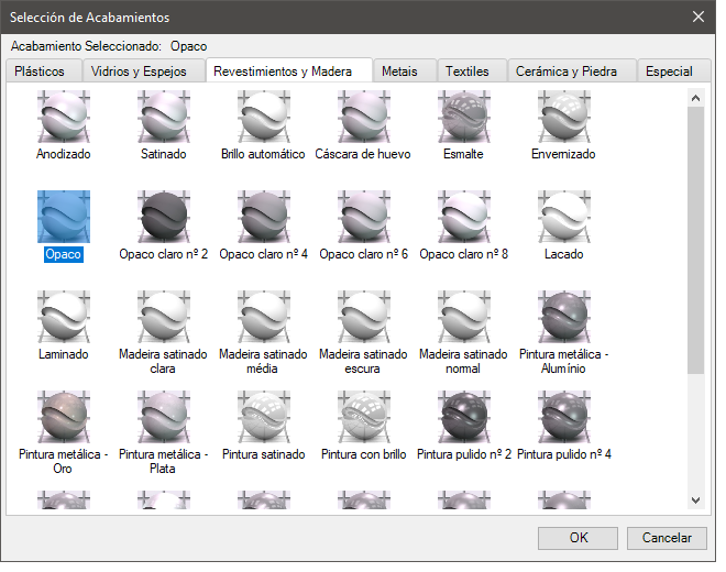7. En la ventana que aparece, seleccione el acabado que desea que tenga el material cuando sea renderizado por Real Scene y haga clic en Seleccionar.