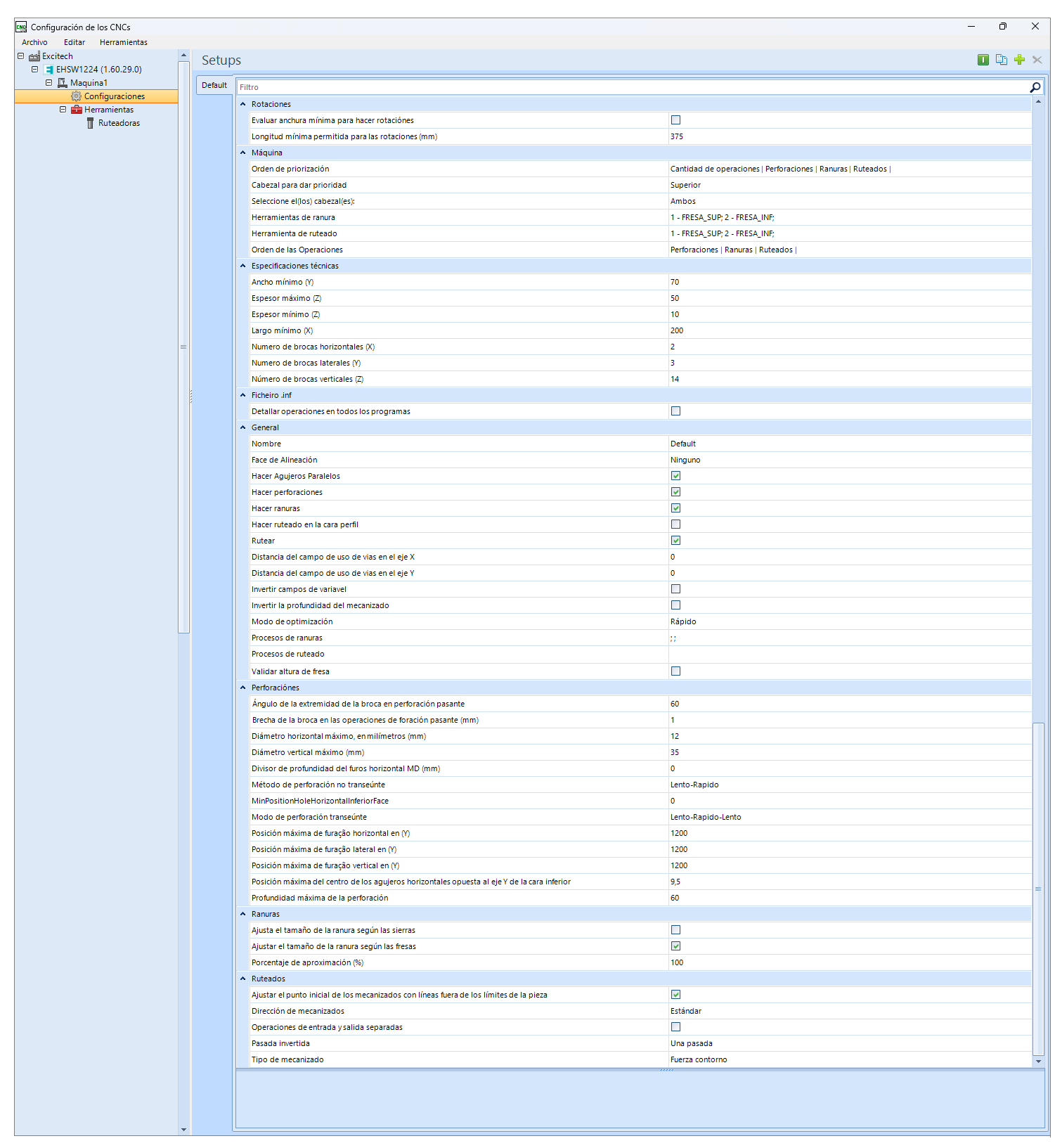 Compruebe a continuación las especificaciones y configuraciones disponibles en el plugin de la máquina Excitech EHSW1224: