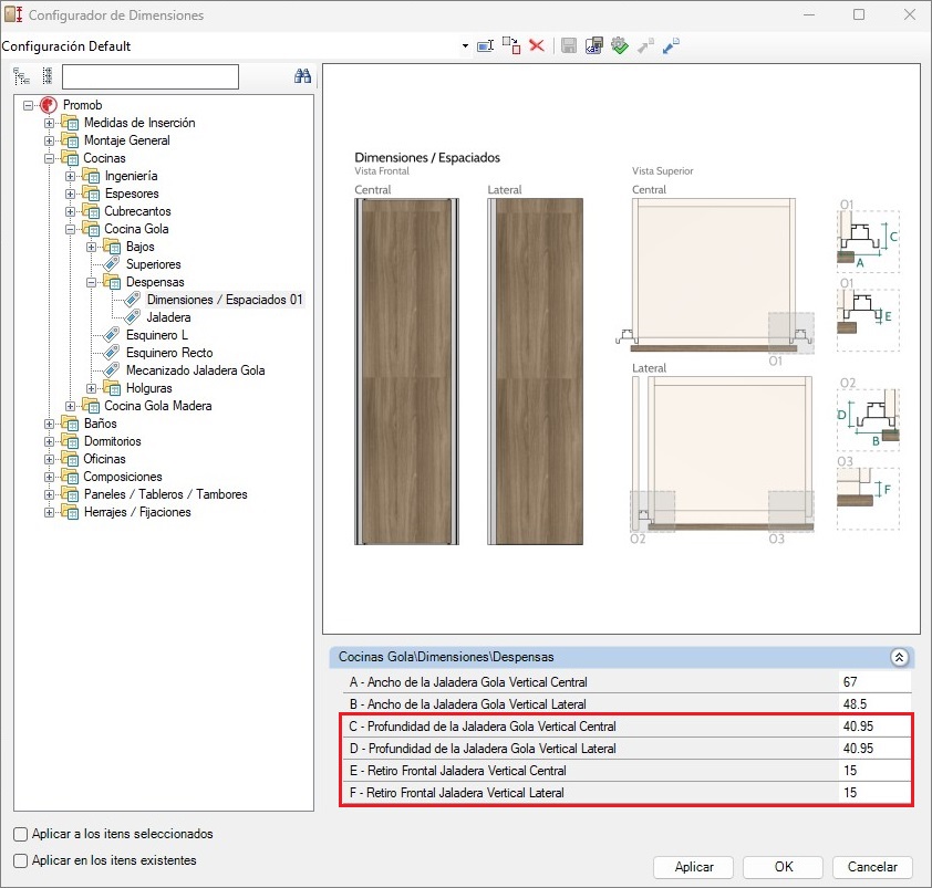 1. Disponible nuevos parámetros en el Configurador de Dimensiones para modificar la profundidad de las jaladeras de los módulos con gola superior, intermediario, lateral y central, así como el retiro frontal de las despensas, de manera separado. Estas nuevas configuraciones están disponibles en la línea de Cocinas Gola, en los módulos bajos y despensas, que pueden ser ajustadas mediante los siguientes caminos: