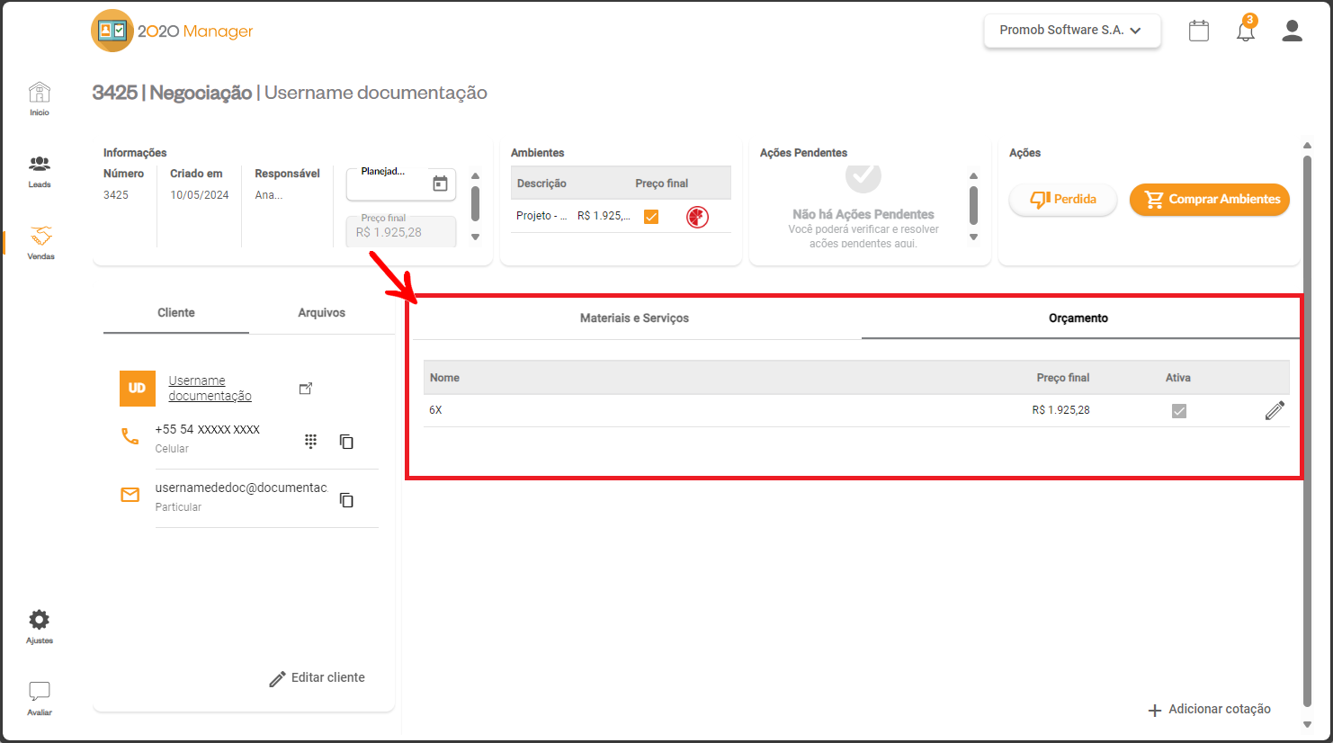 3. A tela da Negociação é exibida, clique na aba Orçamento para visualizar o orçamento do seu projeto.