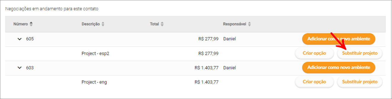 - Para isso, na negociação, clique na opção Substituir Projeto.
