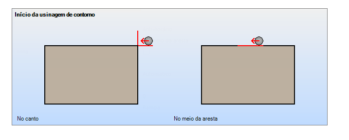 Início da usinagem de contorno: define onde é o início da usinagem de contorno, em um dos cantos ou no meio de uma das arestas da peça. Essa opção é aplicável somente as usinagens de contorno externa.