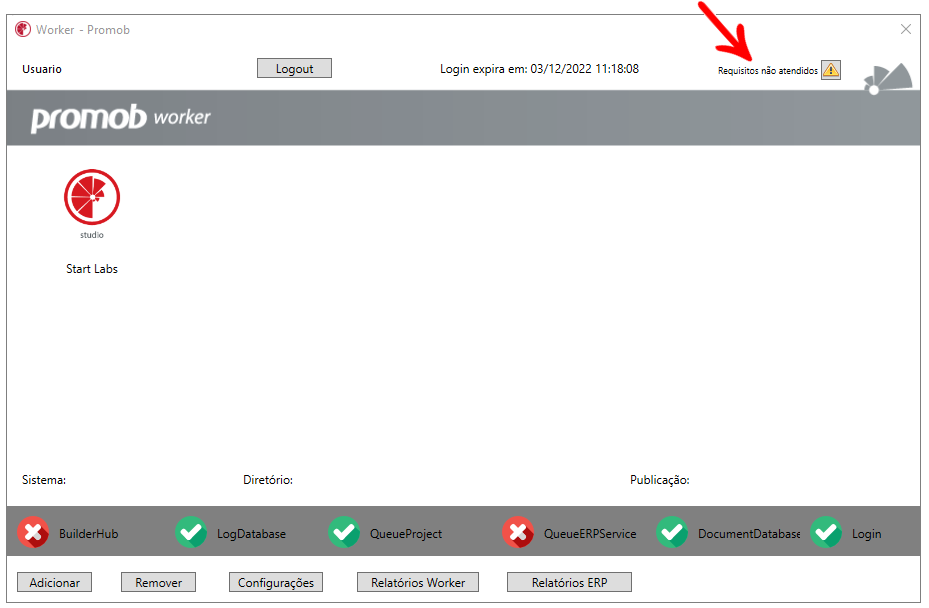 Na tela inicial do Worker, é exibida a mensagem de Requisitos não atendidos.