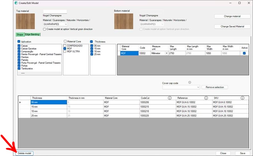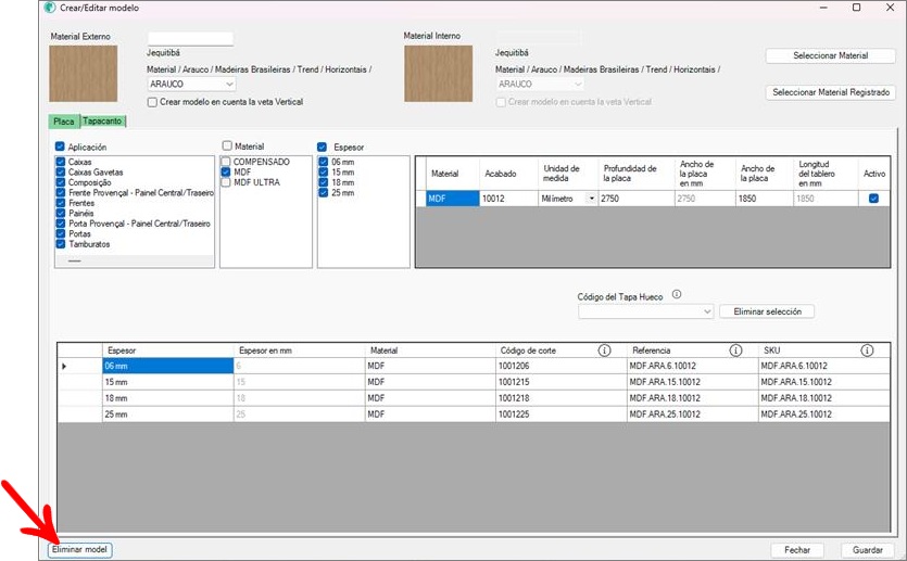 - Para aba de cadastro de fita de borda, desmarque o modelo em Espessura, Tipo e Altura.