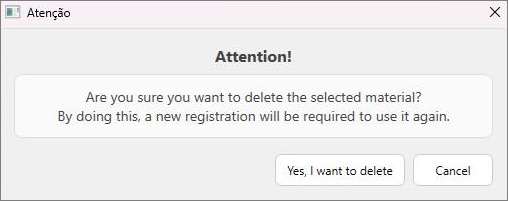 A funcionalidade Excluir Modelos permite excluir um modelo específico cadastrado para determinado material, ou excluir todos os modelos cadastrados para o material em questão.