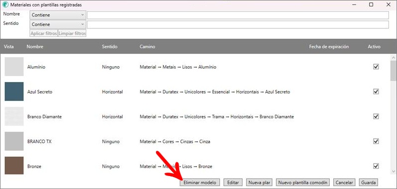 Também é possível acessá-la através da tela Materiais com modelos cadastrados, selecionando a opção Excluir Modelo.