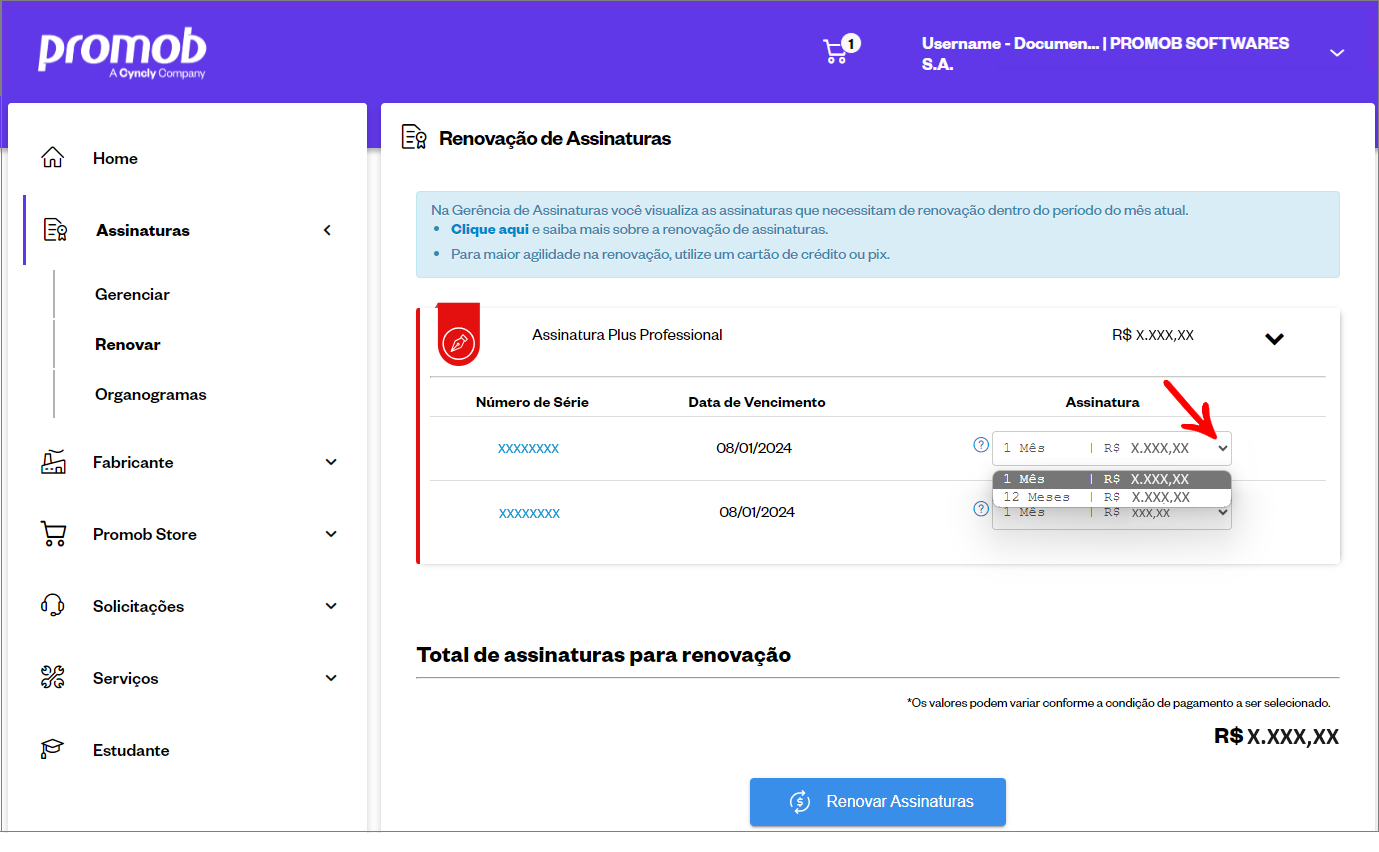 Através do Portal de Serviços Promob, é possível fazer a alteração do período de renovação de assinaturas de mensal, para anual.