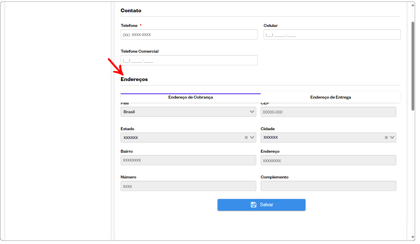No campo Endereço de Cobrança e Endereço de Entrega, é possível fazer as alterações de País, CEP, Estado, Cidade, Bairro, Endereço, Número e Complemento. Após as alterações, clique em Salvar.