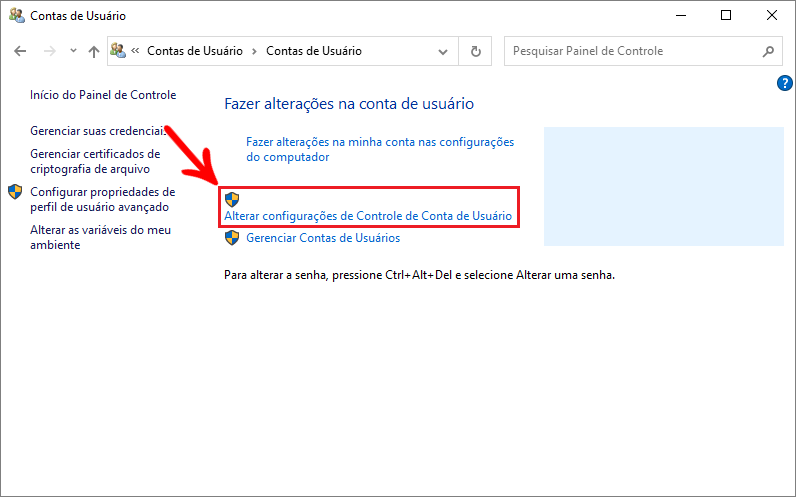 4. Selecione a opção Alterar Configurações do Controle de Conta de Usuário;