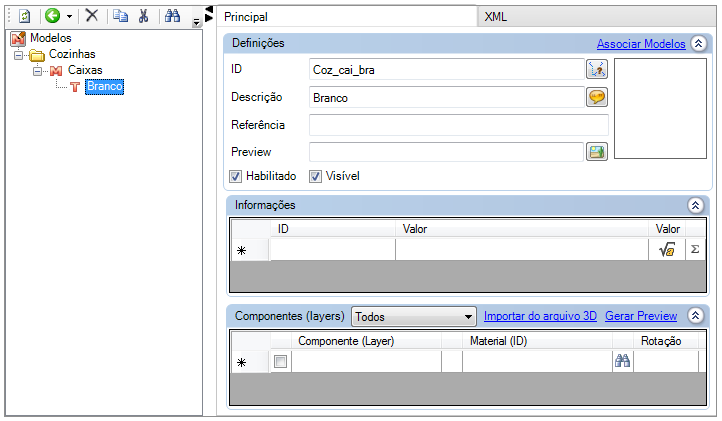 Habilitado: quando habilitado, exibe o modelo no Editor de Modelos e também no Painel de Ferramentas - Modelos. Quando desabilitado, mantém o cadastro do modelo, mas não o exibe no Painel de Modelos, apresentando a mensagem “Projeto com modelos não disponíveis” no ambiente 3D e exibindo o contorno dos itens em azul.