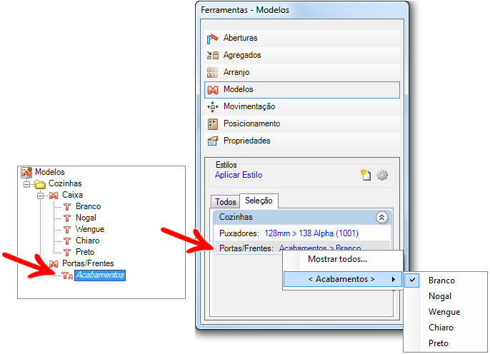 Módulos que possuem mais de uma opção de acabamentos necessitam a aplicação de Modelos.