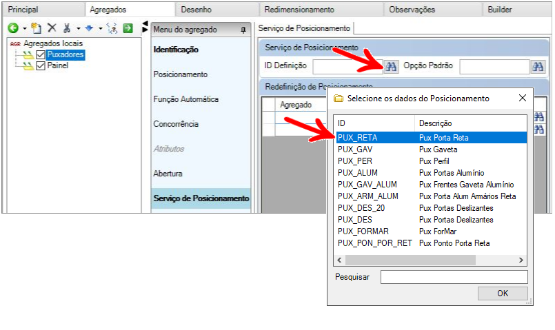 2. Após fazer o cadastro e configuração do agregado grupo de puxadores agregado na porta/frente, selecione o agregado e localize a aba Serviço de Posicionamento.