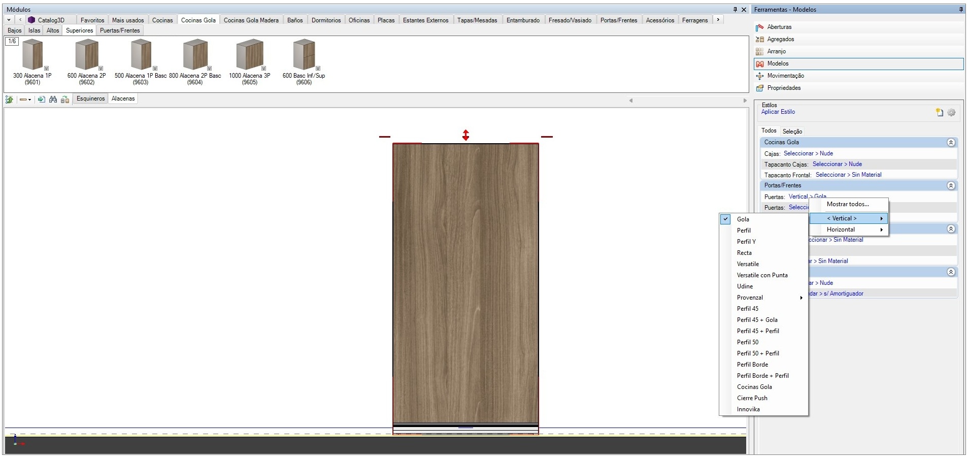 1. Se pusieron a disposición 17 nuevos modelos de puertas para los módulos superiores en la línea Cocinas Gola. Los modelos son: Gola, Perfil, Perfil Y, Recta, Versatile, Versatile con Punta, Udine, Provenzal, Perfil 45, Perfil 45 + Gola, Perfil 45 + Perfil, Perfil 50, Perfil 50 + Perfil, Perfil Borde, Perfil Borde + Perfil, Cierre Push y Innovika. (2244292)