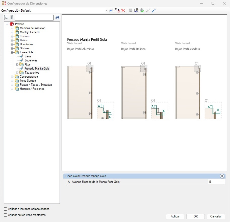 2. Disponibles nuevos parámetros en las líneas de Cajoneros y Piletas de la Línea Gola para definir las medidas hasta el tirador C y el tamaño del primer cajón del módulo. La antigua configuración de altura del primer cajón ha sido desactivada para que la nueva configuración estandarice más módulos. En el Configurador de Dimensiones los nuevos parámetros están en la ruta: